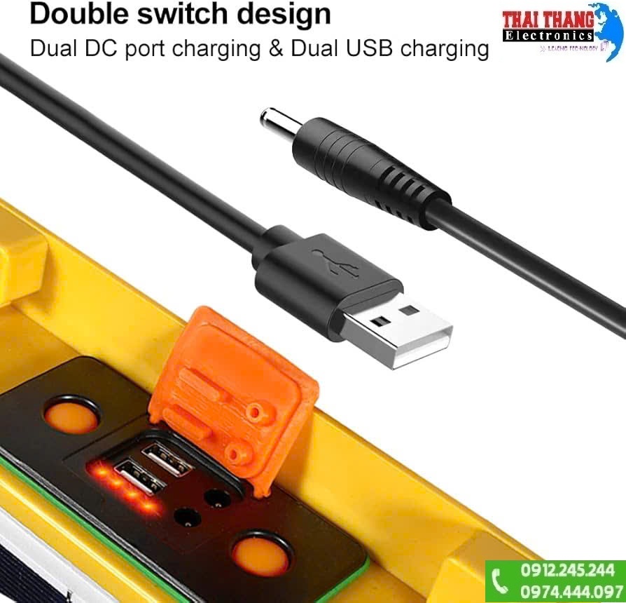 Sản phẩm được trang bị pin sạc dung lượng 50.000mAh, cho phép đèn hoạt động liên tục trong thời gian dài mà không phụ thuộc hoàn toàn vào nguồn điện lưới. Ở chế độ sáng mạnh, đèn có thể chiếu sáng liên tục khoảng 15 giờ, trong khi chế độ sáng yếu giúp kéo dài thời gian sử dụng lên đến 50 giờ, phù hợp cho các ca làm việc dài hoặc sử dụng qua nhiều ngày.