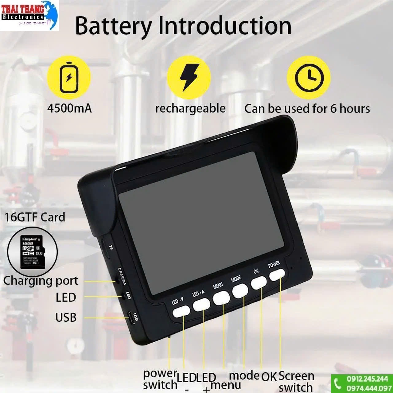 Hệ thống dây cáp sợi quang (Fiberglass Cable) đường kính khoảng 5mm có độ bền cao, chống uốn gập và chịu lực tốt, hỗ trợ luồn qua các đoạn ống cong một cách linh hoạt. Người dùng có thể tùy chọn chiều dài cuộn dây 10m, 20m, 30m hoặc 50m tùy theo nhu cầu công việc; cuộn cáp tích hợp giá đỡ giúp cuốn – nhả – di chuyển thuận tiện. Thiết bị sử dụng pin lithium dung lượng lớn 4500mAh cho thời gian hoạt động liên tục khoảng 6 giờ, thời gian sạc khoảng 5 giờ, nguồn vào DC 5V (5V–1A tiêu chuẩn) và hiển thị mức pin trực tiếp trên màn hình, phù hợp cho các ca kiểm tra dài hoặc công trình quy mô lớn mà không lo gián đoạn.