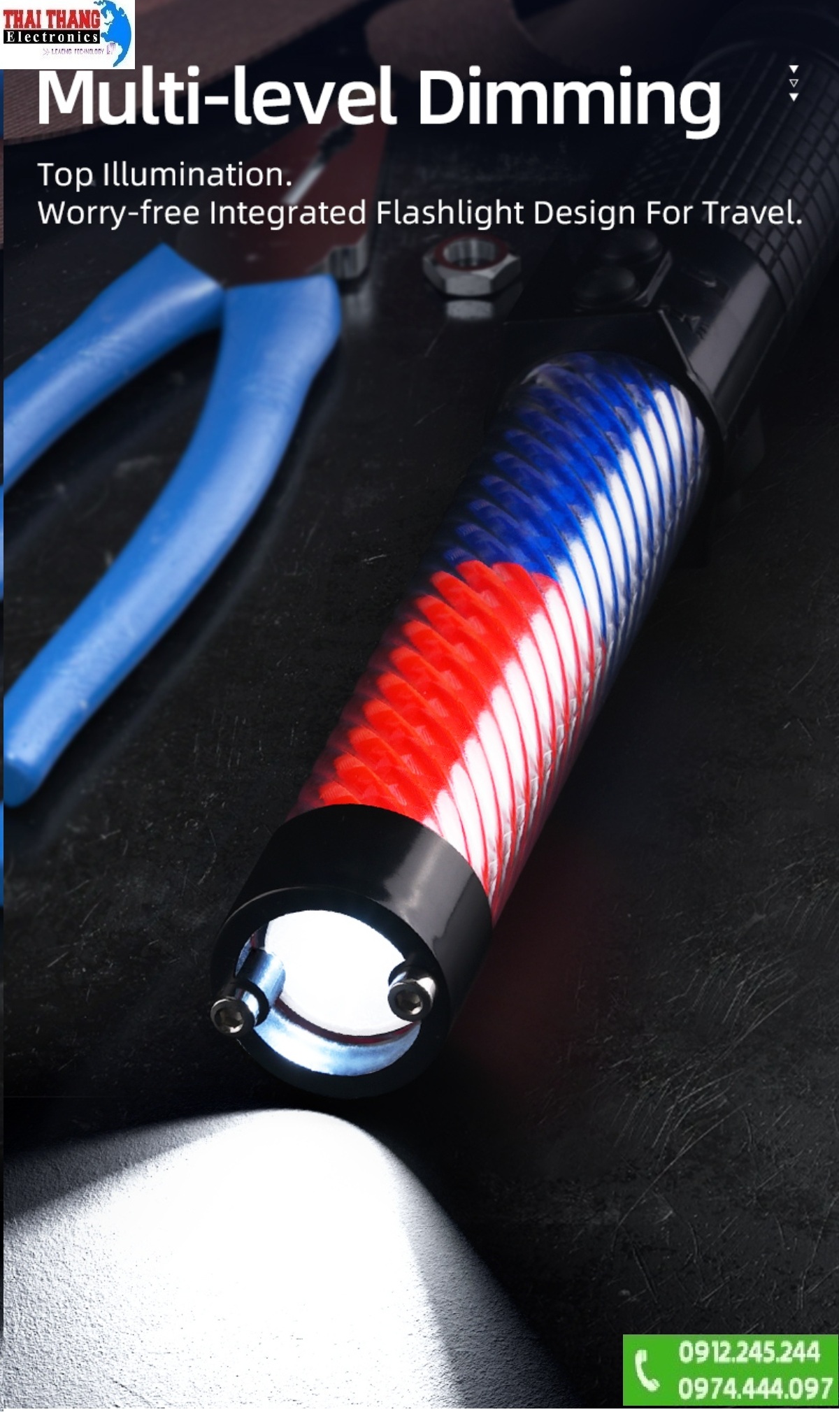 Lớp phủ ngoài có khả năng chống nước chuẩn IP55, giúp thiết bị vận hành ổn định trong điều kiện mưa, ẩm hoặc môi trường ngoài trời khắc nghiệt – điều mà nhiều dòng đèn pin phổ thông không thể đáp ứng được.